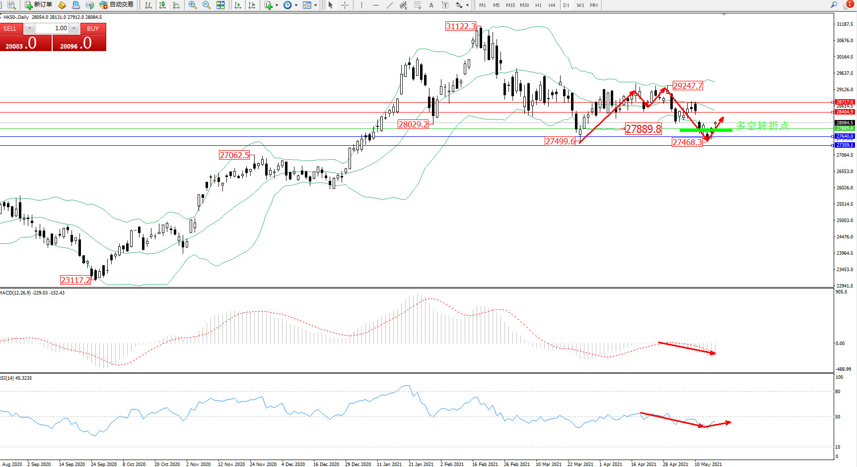 技术点评:空头动力延续布林带指标通道中下轨区间呈阶梯式震荡下行,低位抵达27468位置后得到短暂支撑反转上移,多头动力有伺机入场态势,布林带指标呈张口走势后开始缓慢收口,MACD指标处于0轴线下方空头区域弱势整理下移,RSI指标处于50均衡线下方空头区域维持窄幅整理中;