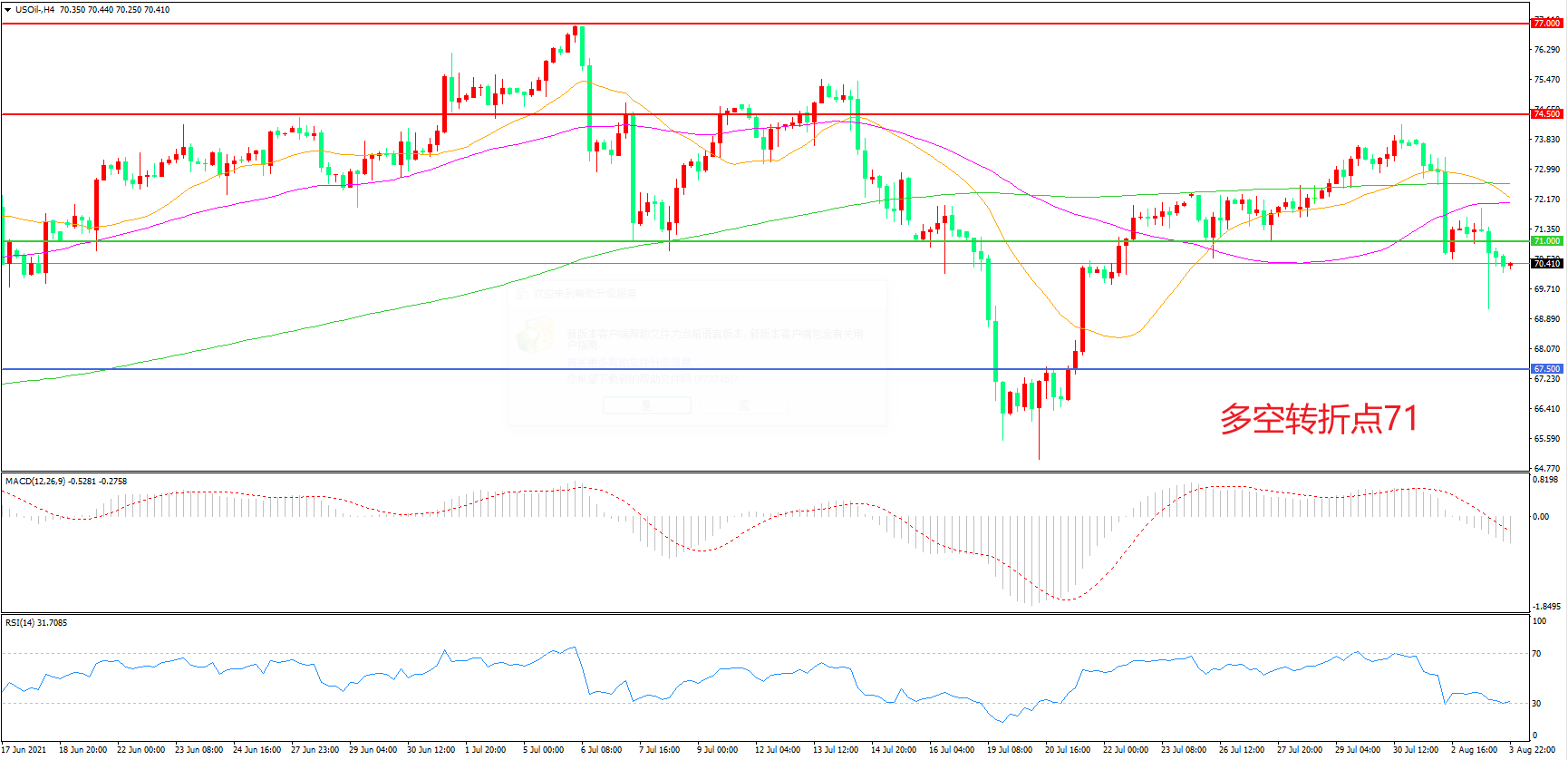 周二(8月3日),尽管对经济复苏的担忧导致了油价下行,但中东地区的紧张局势对油价形成了支撑,美国WTI原油小幅下行,收报70.41美元/桶。周三(8月4日)凌晨,根据美国协会公布的数据显示,当周API原油库存减少87.9万桶,降幅不及预期,如果晚间EIA数据与此表现一致,有可能引发油价的进一步“跳水”。