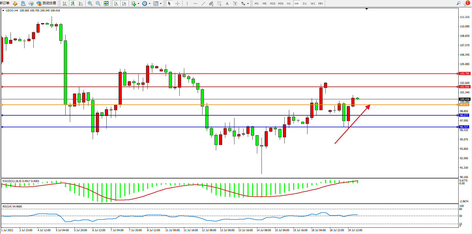 4小时图看:低位多头动力维持震荡,短期有继续向上移动态势,MACD指标处于0轴线上側徘徊,RSI指标处于50均衡线上側窄幅整理;