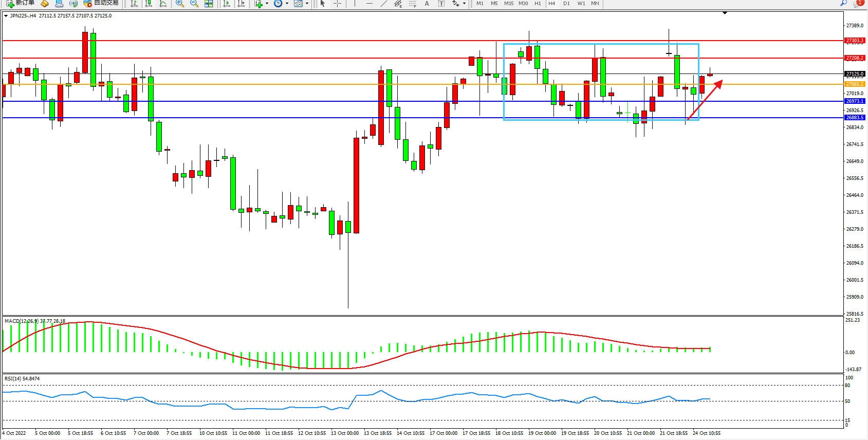 日经225指数10月24日(周一)收盘上涨88.92点,涨幅0.33%,报26979.50点。日本政府在支出计划中敦促日本央行警惕市场剧烈波动对经济的影响,该计划旨在缓冲生活成本上升带来的冲击。