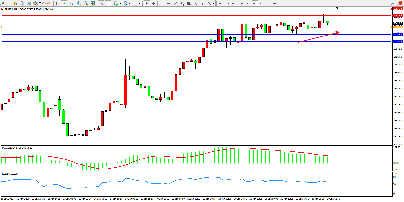 日经225指数1月30日(周一)收盘上涨15.94点,涨幅0.06%,报27398.50点。日本的政策建言组织“令和国民会议”(令和临调)30日发表紧急提议,要求更新政府和央行的联合声明,将力争“尽早实现”的物价上涨率达2%定位为“长期目标”。