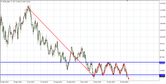 WTI原油日线图显示,油价打破破近三个月以来区间整理格局(73-82美元),表明空头仍存进一步看跌意愿,但下方同时面临前期低位70美元及65美元支撑,预计下行空间将受到制约。